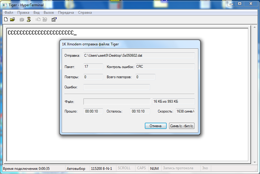 Проблема в том что как бы мы их не подключали, напрямую через COM, через перходник RS232 - USB, у нас нет надписи "СССССССССССССС" в гипертерминале (пробовали и Windows XP и Windows 7).