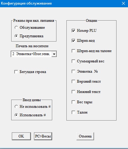 В SPCT есть меню: Конфигурация - конфигурация обслуживания. Там вверху слева можно выбрать, в каком режиме будут загружаться весы при включении: предупаковка или обслуживание. Ставь предупаковку.